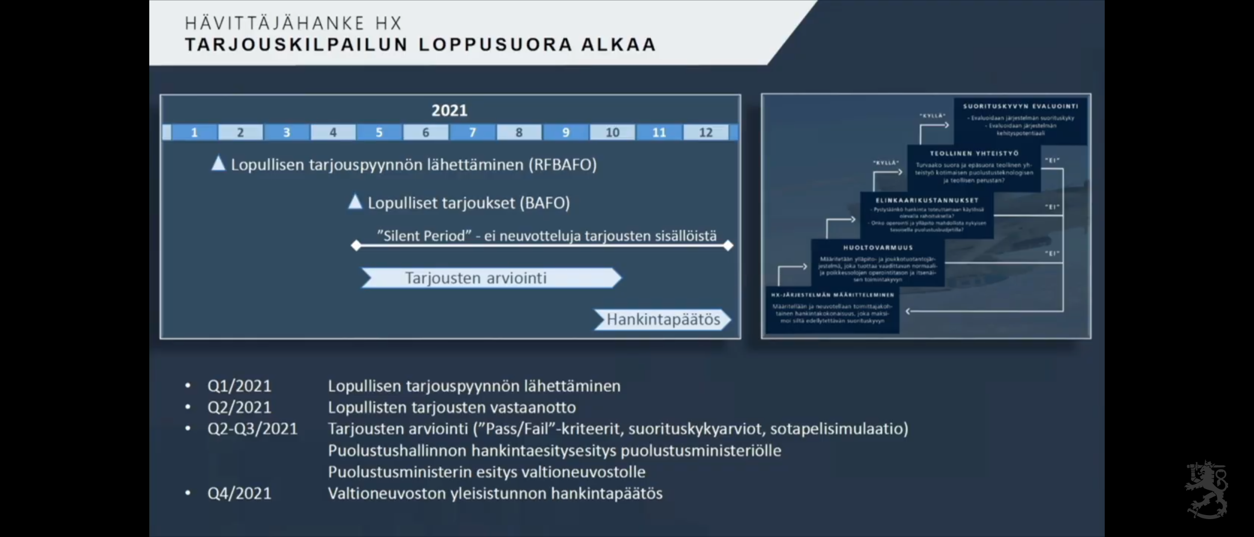Yesterday we got to see another HX presser, this time dealing with the final year of the competition. Held by the usual suspects – Minister of Defence Antti Kaikkonen, major general (engineering) Kari Renko of the Finnish Defence Forces Logistics Command, and Program Director Lauri Puranen – there were no big shifts in the messaging. However, there were some interesting comments, and a confirmation of the current schedule.