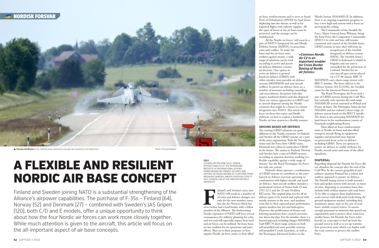 It was a great privilege to get the opportunity to write it together with colonel (ret.) Per Erik Solli of the Norwegian Institute of International Affairs and brigadier general Anders Persson, deputy vice-chancellor at the Swedish Defence University, who both are extremely knowledgeable when it comes to the Norwegian and Swedish Air Forces in particular, and the general topic of Nordic airpower. Our recommendations included for Norway to also adopt a greater reliance on protection by dispersal and unpredictability – not unlike the USAF’s Agile Combat Employment – as well as for all three countries to put a greater emphasis on regional cross border basing and a common Nordic air C2.