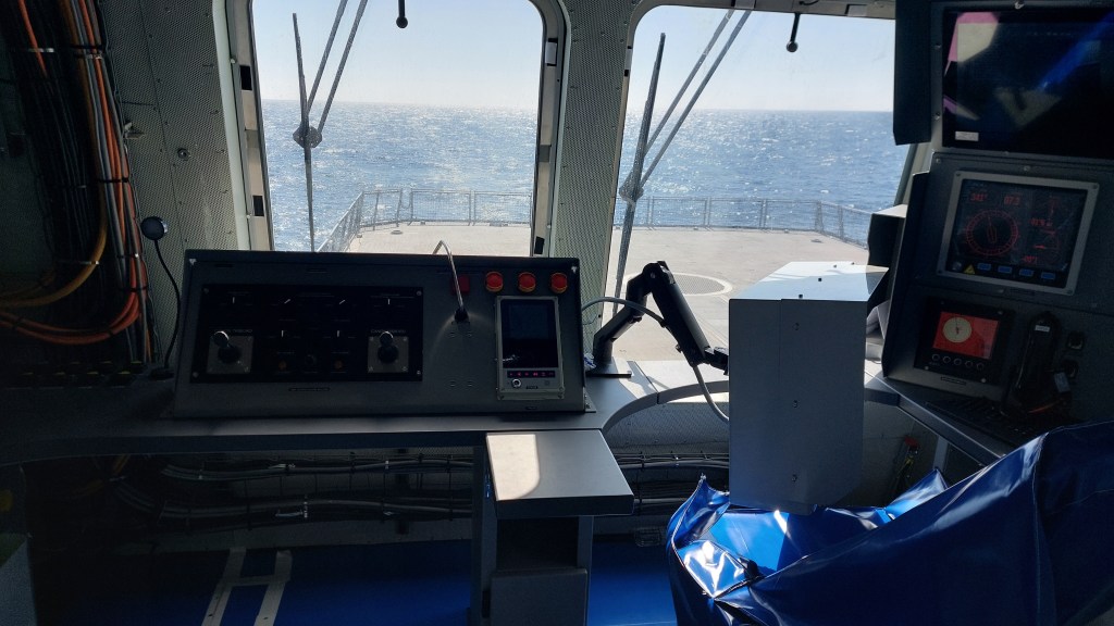 You are also able to handle all functions needed to keep the FDI moving from the position of the flying control (FLYCO), the working station up high in aftmost part of the superstructure which generally is responsible for what happens on the flight deck. This really comes into play only when you have a catastrophic event such as the whole bridge being blown away, as while you can handle all the things needed – steering, power, propulsion, IPMS, … – the simple fact that the window is directed straight to the rear over the flightdeck means your watchkeeping is bound to suffer a bit. But for getting a wounded ship back home, it is significantly better than direct control on the engines. For watchkeeping while the bridge still is there and functioning, a typical watch is three people – an officer of the watch, a 2nd officer of the watch (whose duties include navigation), and one at the helm. Both bridgewings also have control stations with physical controls to be able to control the vessel from these during docking or other maneuvers in tight waters.