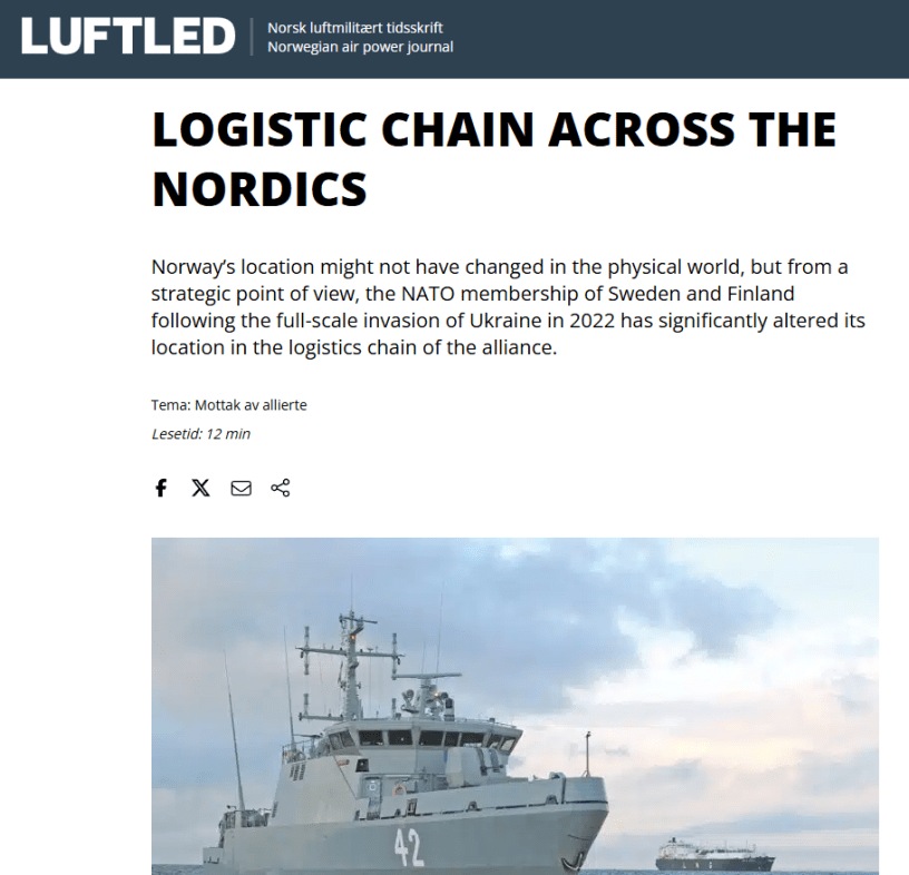 I got the opportunity to write an article for the Norwegian air power journal Luftled on how the Finnish and Swedish NATO memberships have changed Norway’s position in NATO, and the impact it will have. In particular I discuss the fact that any logistical chains drawn on a map will need to have a holistic point of view, identifying bottlenecks for the whole flow from the Atlantic to the front line or civil society that sits on the other end of the route and not just focus on individual nodes or lines. I also note that the fact that these routes involve several different countries means any kind of planning will have a multi-national angle to it, and questions such as who is responsible for which hub when it comes to both logistics and defence might need new thinking.
