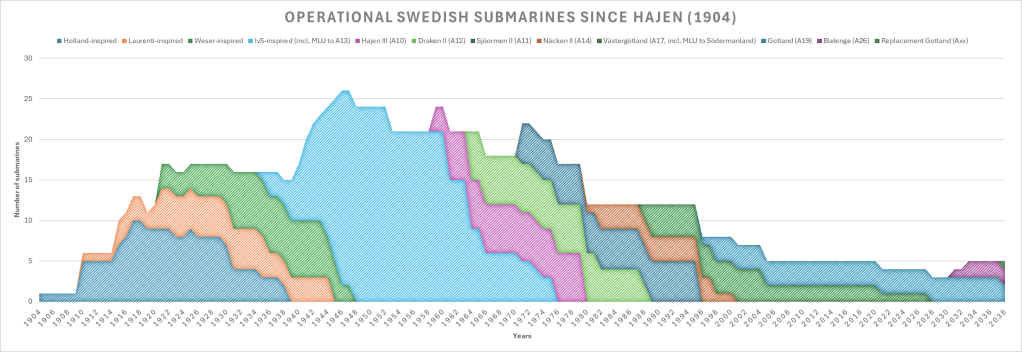 The illustration above is inspired by and based on one found in Fredrik Granholm’s excellent “Från Hajen till Södermanland – svenska ubåtar under 100 år”, and deals with operational submarines – as such it is lagging a bit compared to when the vessels are commissioned. For the early years this shows a rough division into different types of submarines based on their general design characteristics, while starting with the post-war Type XXI-inspired designs the individual classes are displayed. Click on it to see an expanded version with more details.